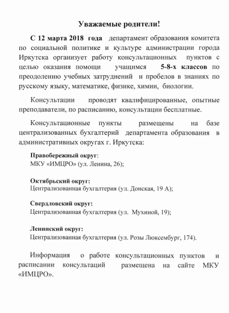 Уважаемые родители! Проводятся бесплатные консультации по предметам с целью оказания помощи при затруднении в изучении школьных предметов.